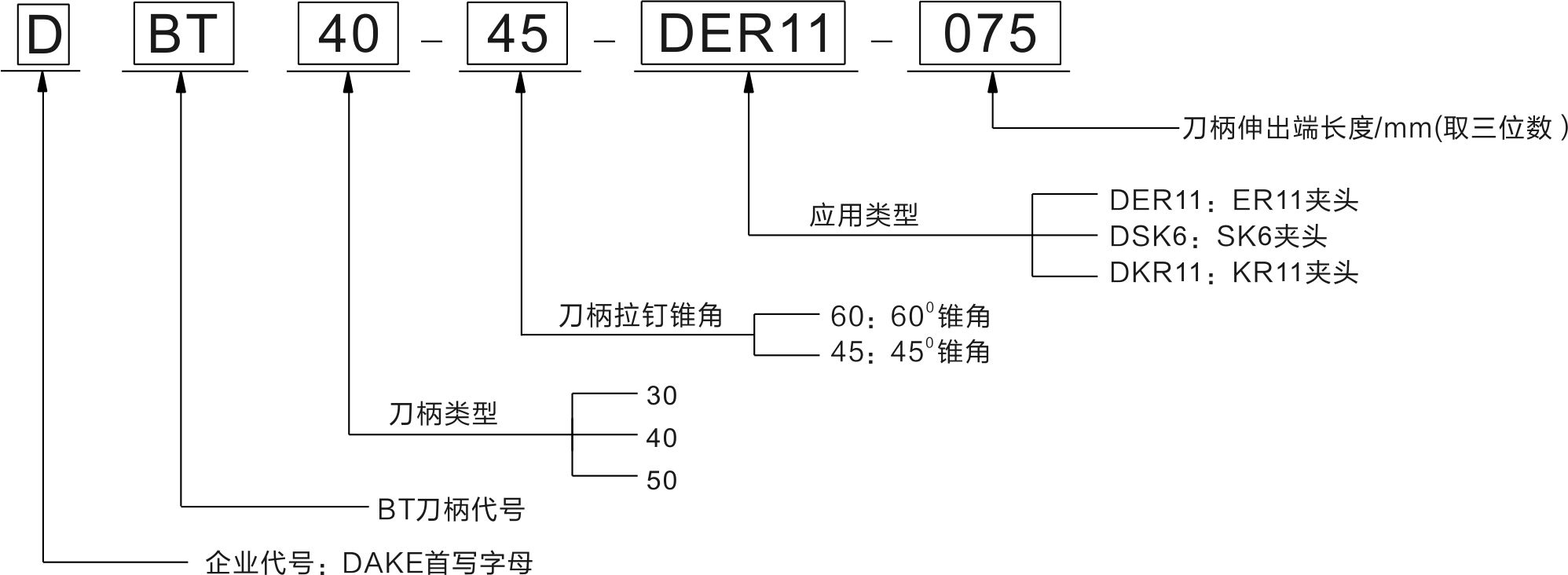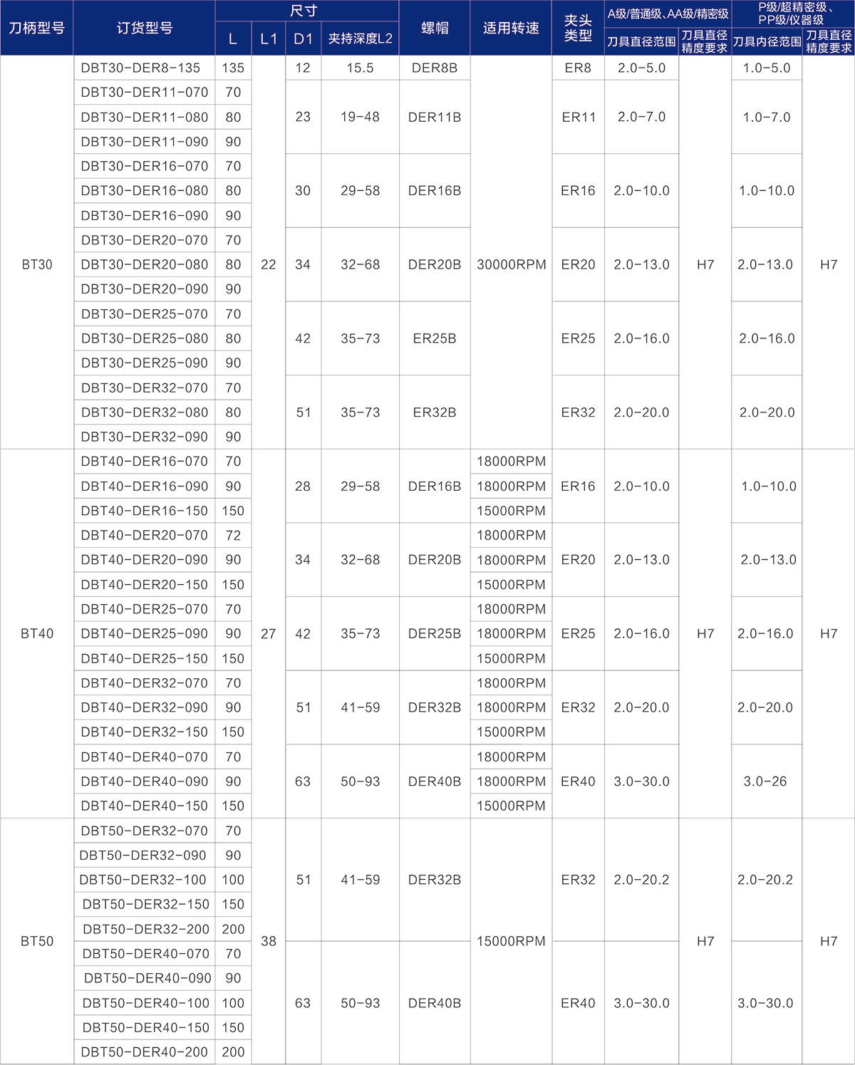 BT刀柄配合ER夹头的优势为:重复精度高(≤5μm),使用寿命长,可夹持范围为Φ1.0-30.0mm的H7精度的刀具,广泛应用于铣、钻、攻丝、雕刻等加工领域。