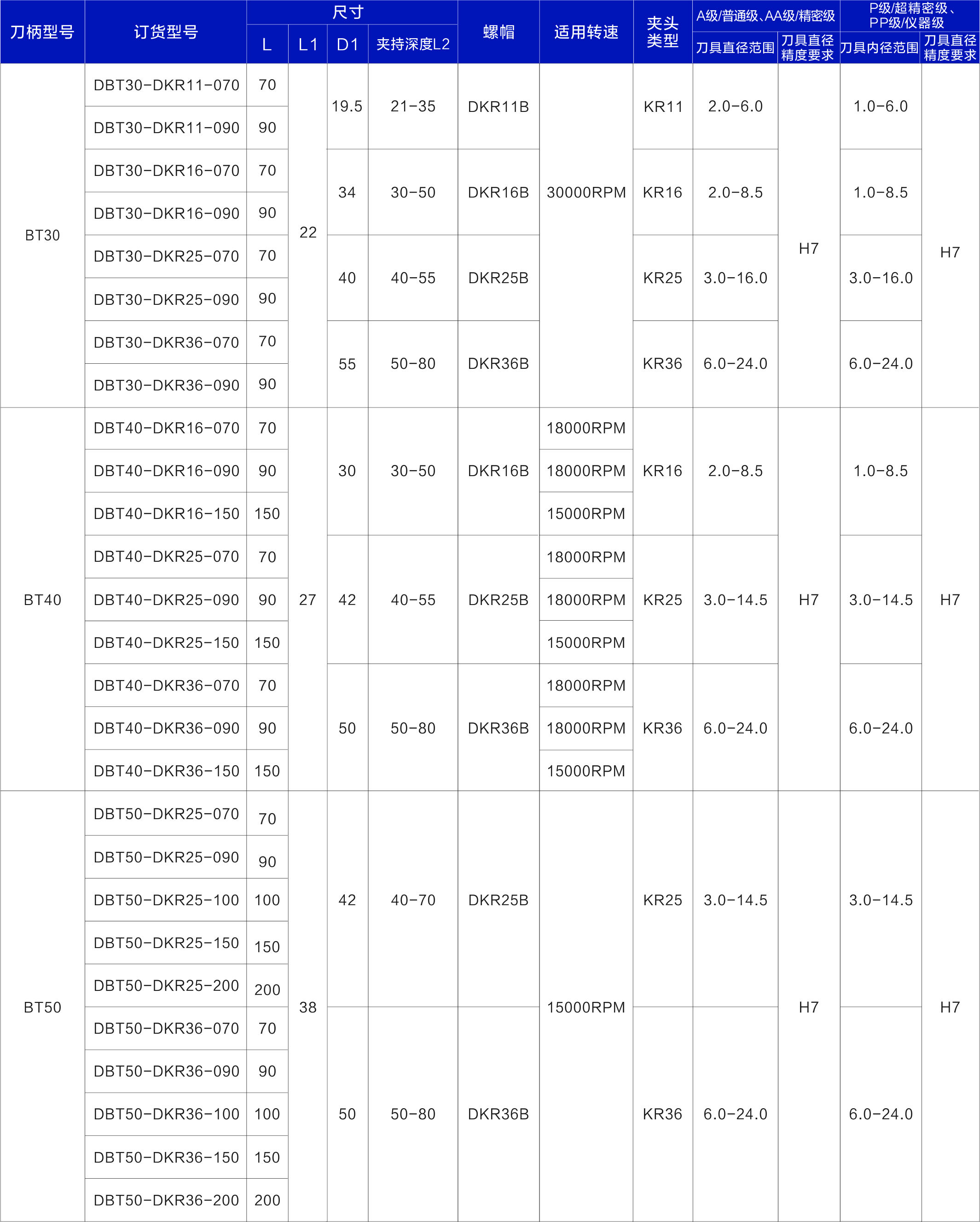 BT刀柄特点BT刀柄配合的KR夹头锥角为5°。BT刀柄配合KR夹头的优势为:重复精度高(≤5μm),使用寿命长,可夹持范围为Φ1.0-24.0mm的H7精度的刀具,广泛应用于铣、钻、攻丝、雕刻等加工领域。高精度:刀柄跳动精度≤2μm。组合跳动精度≤5μm。动平衡等级:≤G1。先进的表面耐磨防锈工艺。结构简单,可以实现快速装卸刀具。适用于较高速的加工中心。